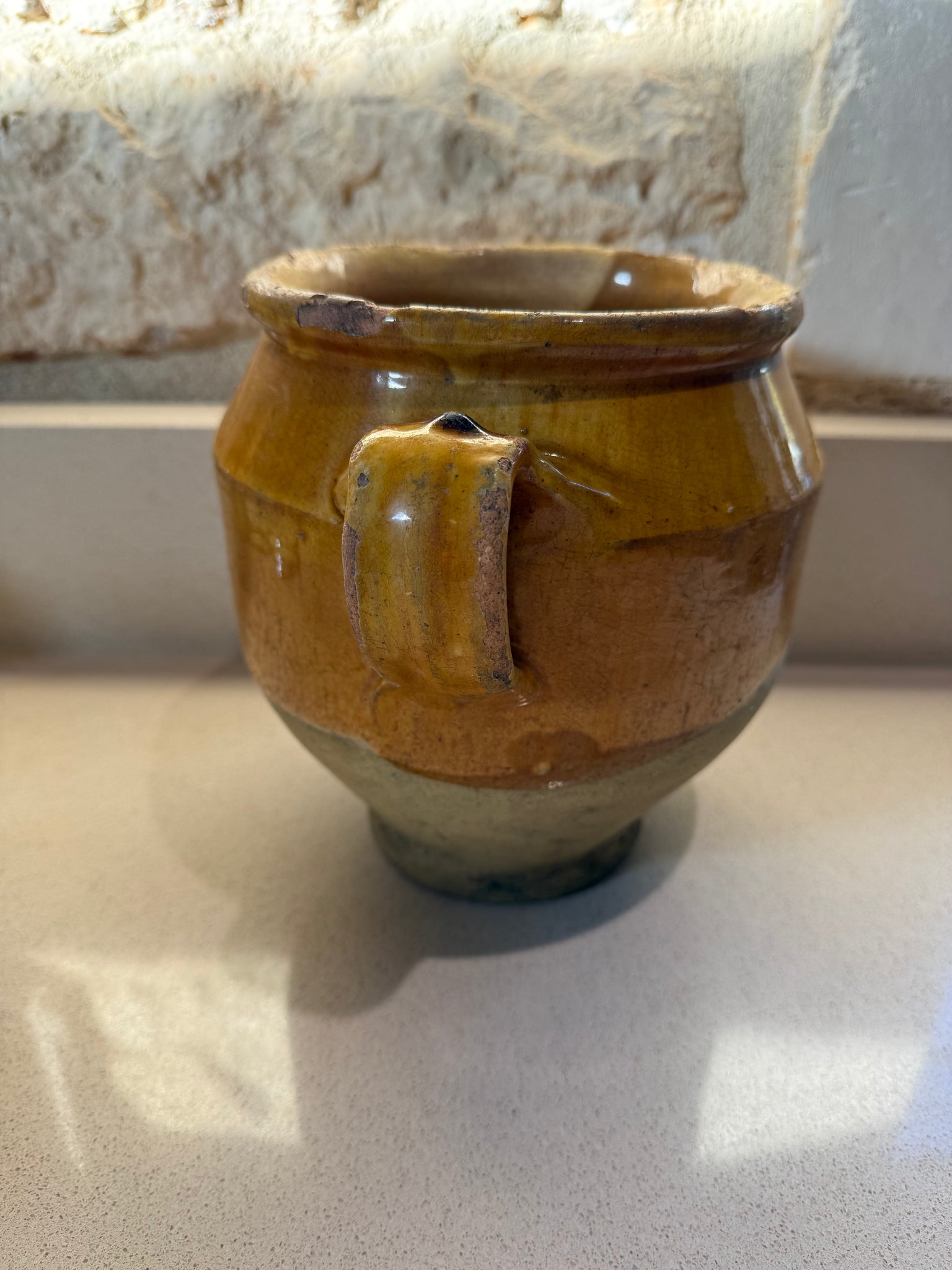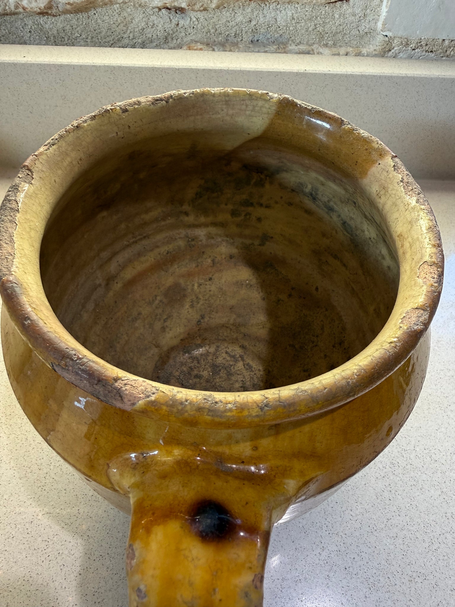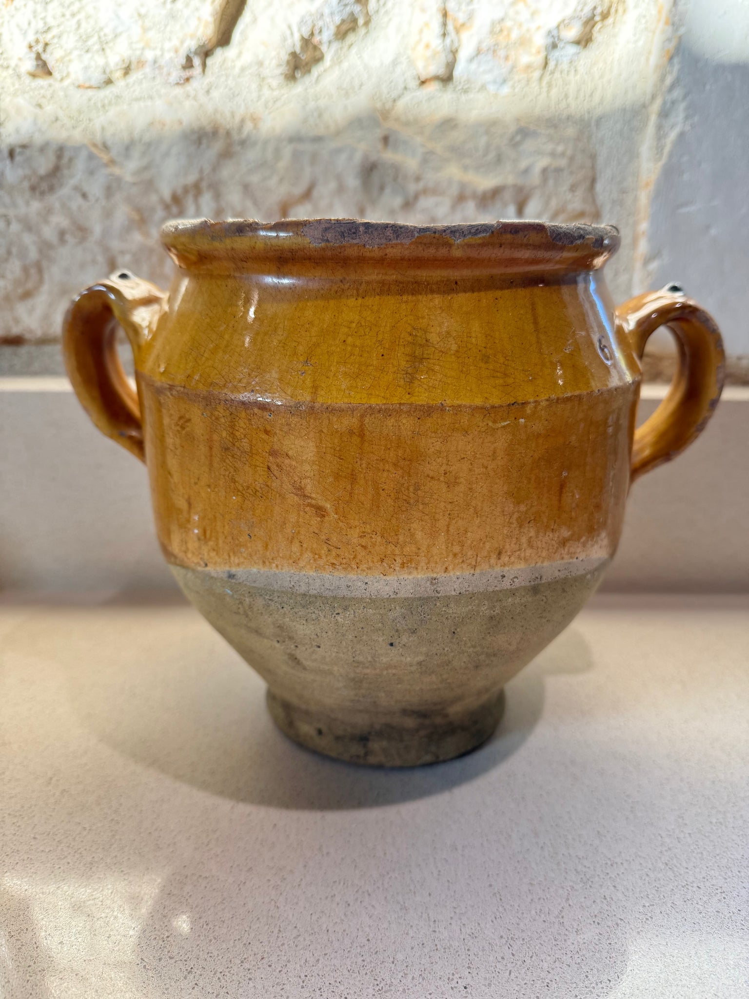 This pot from the mid 1800's is highly collectable. it is from the south west of France and were used for storing duck confit during the winter months when they were placed in the ground outside up to the glaze line. The cooked meat was encased in duck fat inside the pot. The ground acting as natural refrigeration.